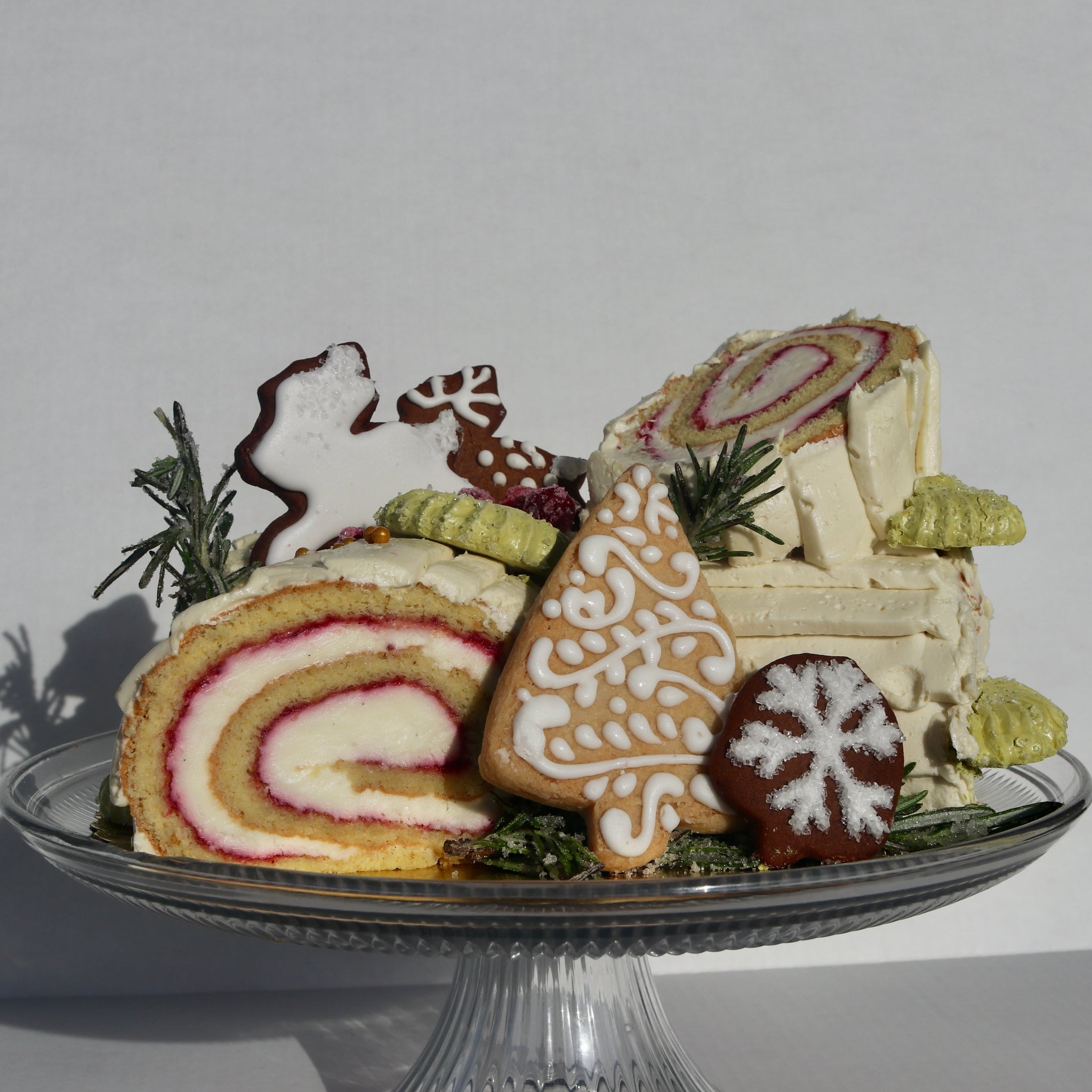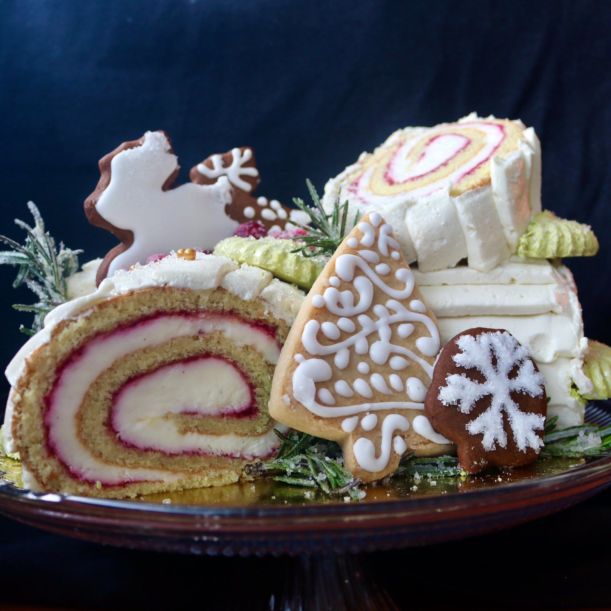 2025 Flavor: Vanilla génoise rolled with cranberry–citrus cheesecake filling and finished with chocolate buttercream for a truly decadent holiday treat.